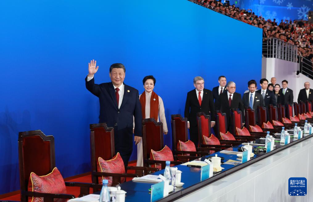 19時(shí)58分,在《和平——命運(yùn)共同體》的樂曲聲中,習(xí)近平和夫人彭麗媛,同國(guó)際奧委會(huì)主席巴赫、亞奧理事會(huì)第一副主席霍震霆等步入主席臺(tái),向觀眾揮手致意。全場(chǎng)響起長(zhǎng)時(shí)間的熱烈掌聲。