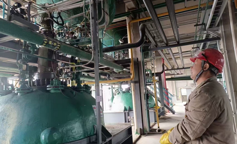 天剛蒙蒙亮,晨光便灑進(jìn)了海利貴溪公司廠區(qū)。丁硫車間那一排高大的反應(yīng)釜,在熹微的曦色里泛著冷峻的金屬光澤。饒斌像往常一樣,早早來到廠里。他熟練地戴上安全帽,手持對講機(jī),開啟了每日雷打不動的車間巡檢工作。他沿著管線,時而停下腳步,側(cè)耳細(xì)聽設(shè)備運轉(zhuǎn)的聲響,時而湊近儀表盤,仔細(xì)查看各項數(shù)據(jù)。不知不覺,一個上午就悄然過去了,而這不過是饒斌日常工作的普通一幕。